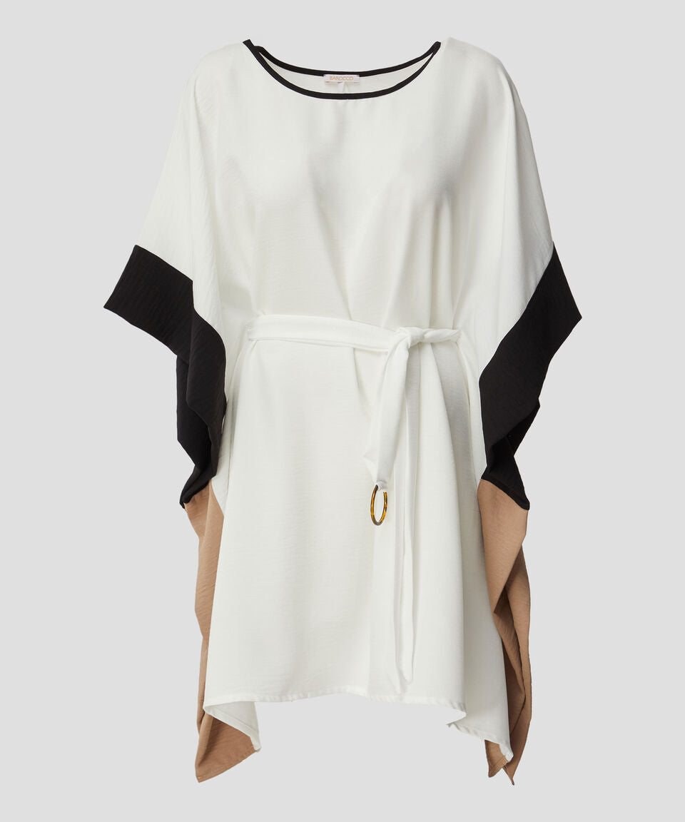 BRISA-731 | Blusón blanco, negro y camel, corte de manga murciélago en bloques de color con cinturón y hebilla dorada.