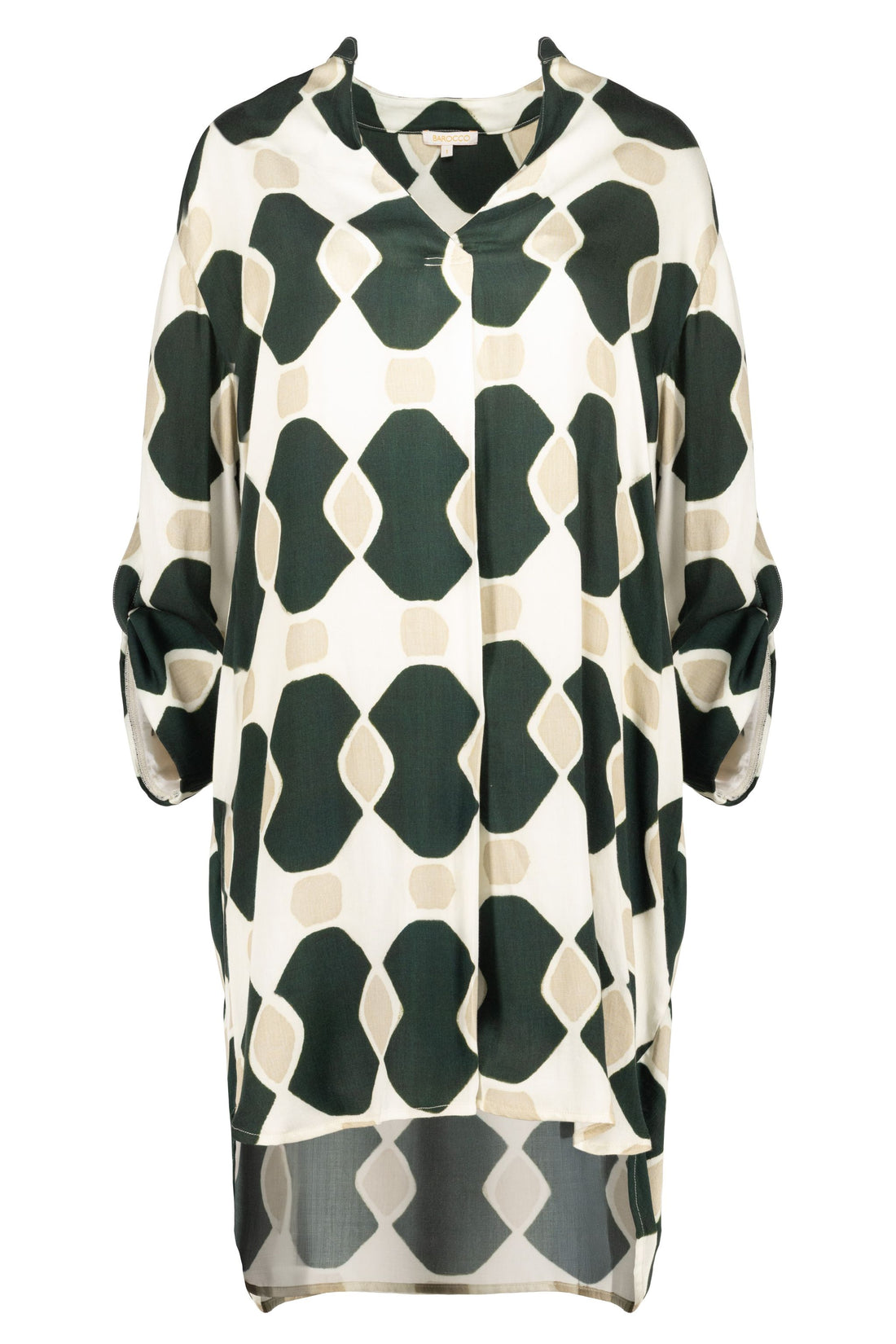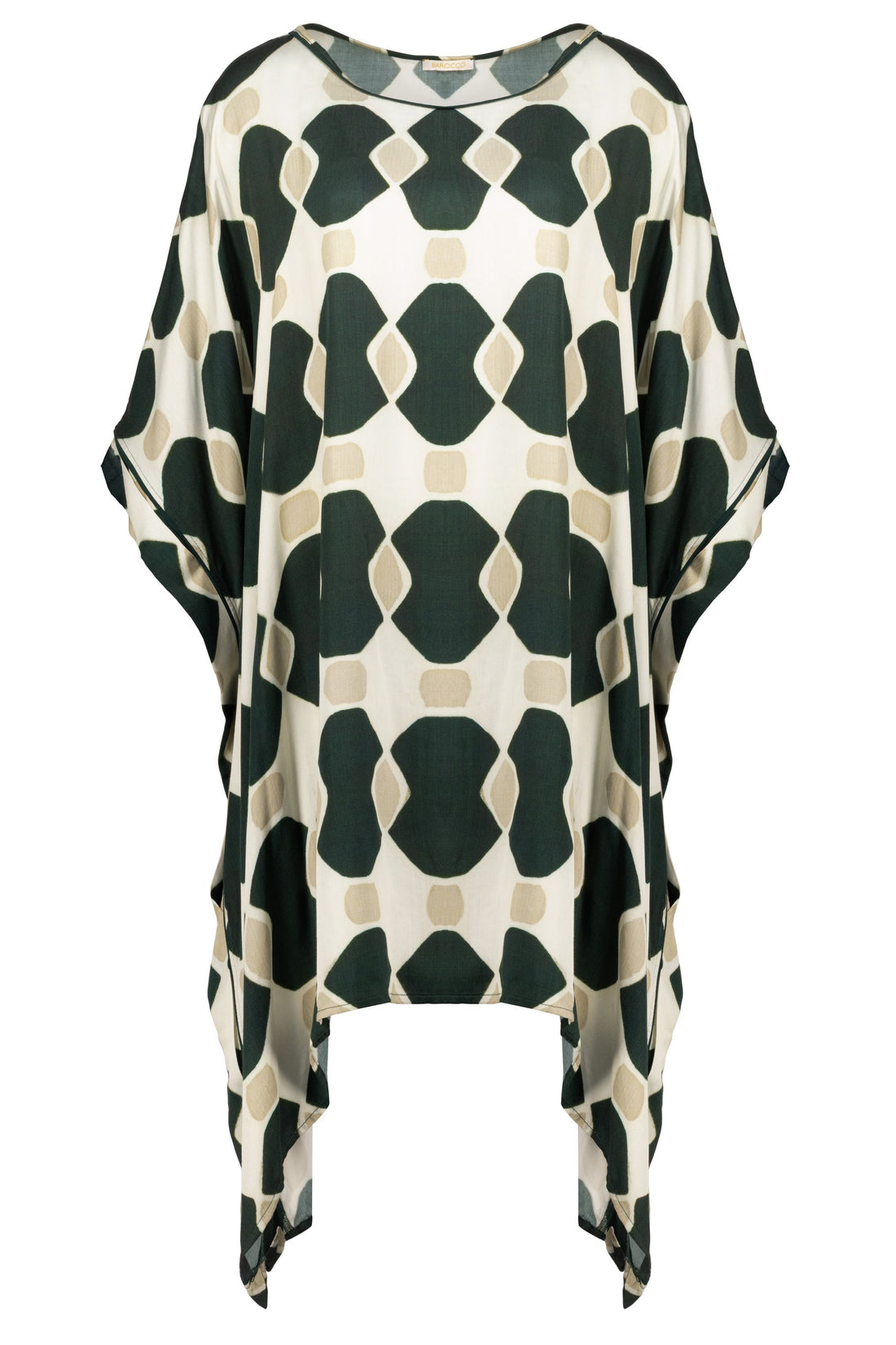 MAREA-634 | Blusón con estampado geométrico, escote redondo y mangas tipo murciélago, silueta fluida de corte recto.