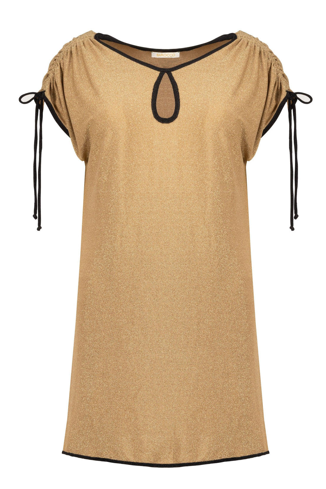 DORIS-904 | Bluson dorado con negro largo, de cuello redondo con abertura en forma de gota, manga corta con detalle de cintas.