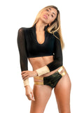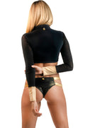 Top presenta manga larga, cuello alto simulado, y puños anchos en color dorado/champán que contrastan con el negro. Bottom de corte brasileño a juego incorpora tiras laterales gruesas en dorado metálico para un efecto visual estructural.