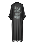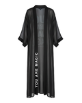 Kaftán negro de diseño sofisticado con detalles únicos que lo convierten en una pieza statement. Confeccionado artesanalmente, combina tela satinada con paneles de mesh en la parte trasera, que aportan ligereza y un toque moderno. El detalle de letras en color plata lo hace aún más especial, perfecto para usar sobre tu traje de baño o como complemento para un look más atrevido.